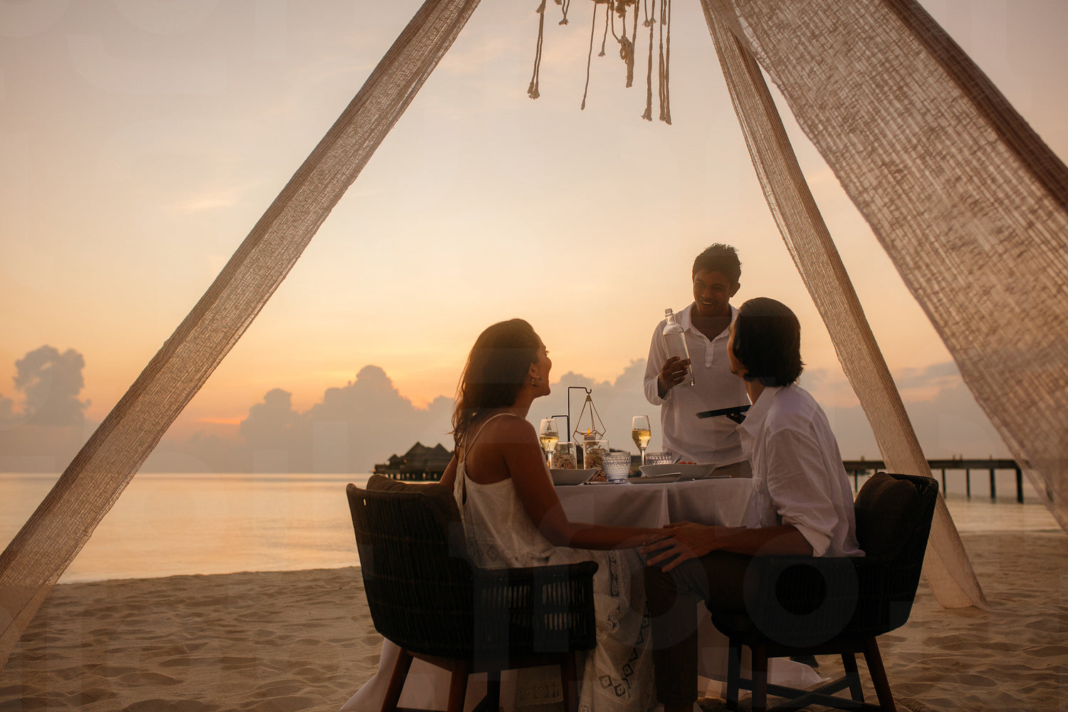 Couple at an exotic beach restaurant celebrating anniversary. Man serving wine to a couple on a sunset dinner.