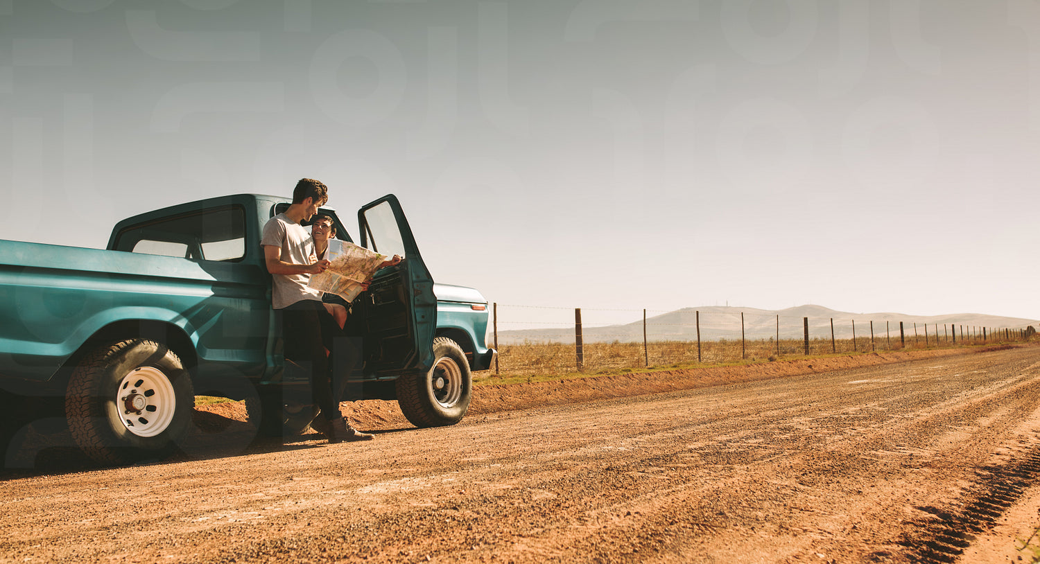 Couple looking at a map for navigation while on a road trip. Man and woman using a map to navigate through the country side.