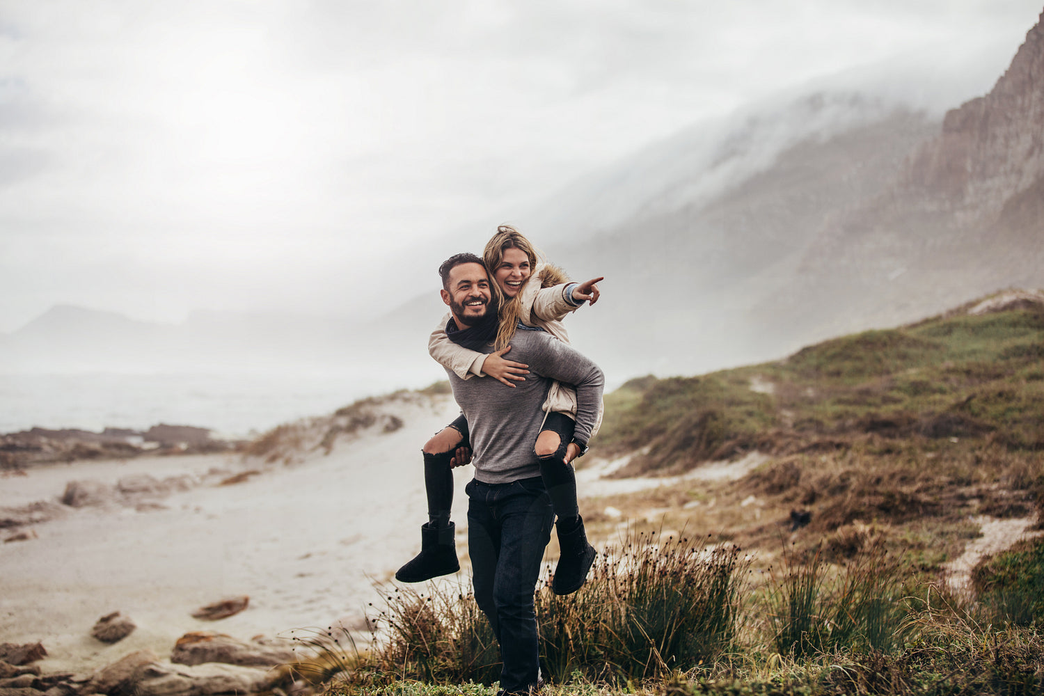 Young couple piggybacking along the beach, with woman pointing away. Couple having fun on winter beach vacation.