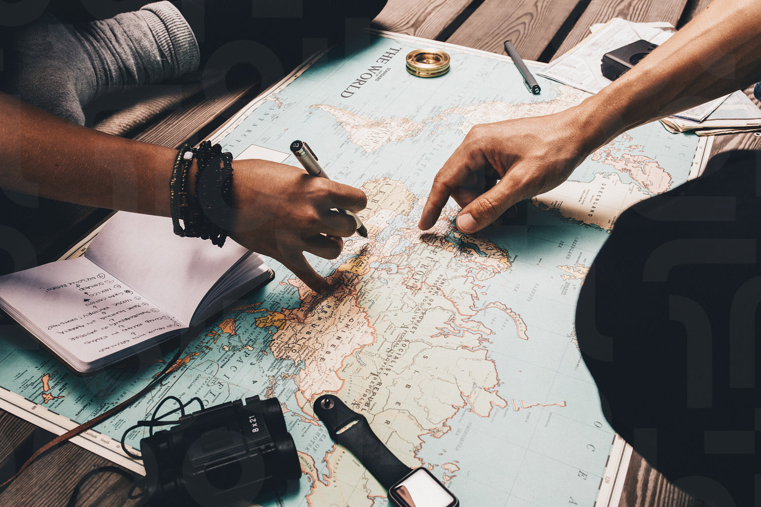 Close up view of man and woman pointing at places on world map. Woman noting vacation plan in a diary.