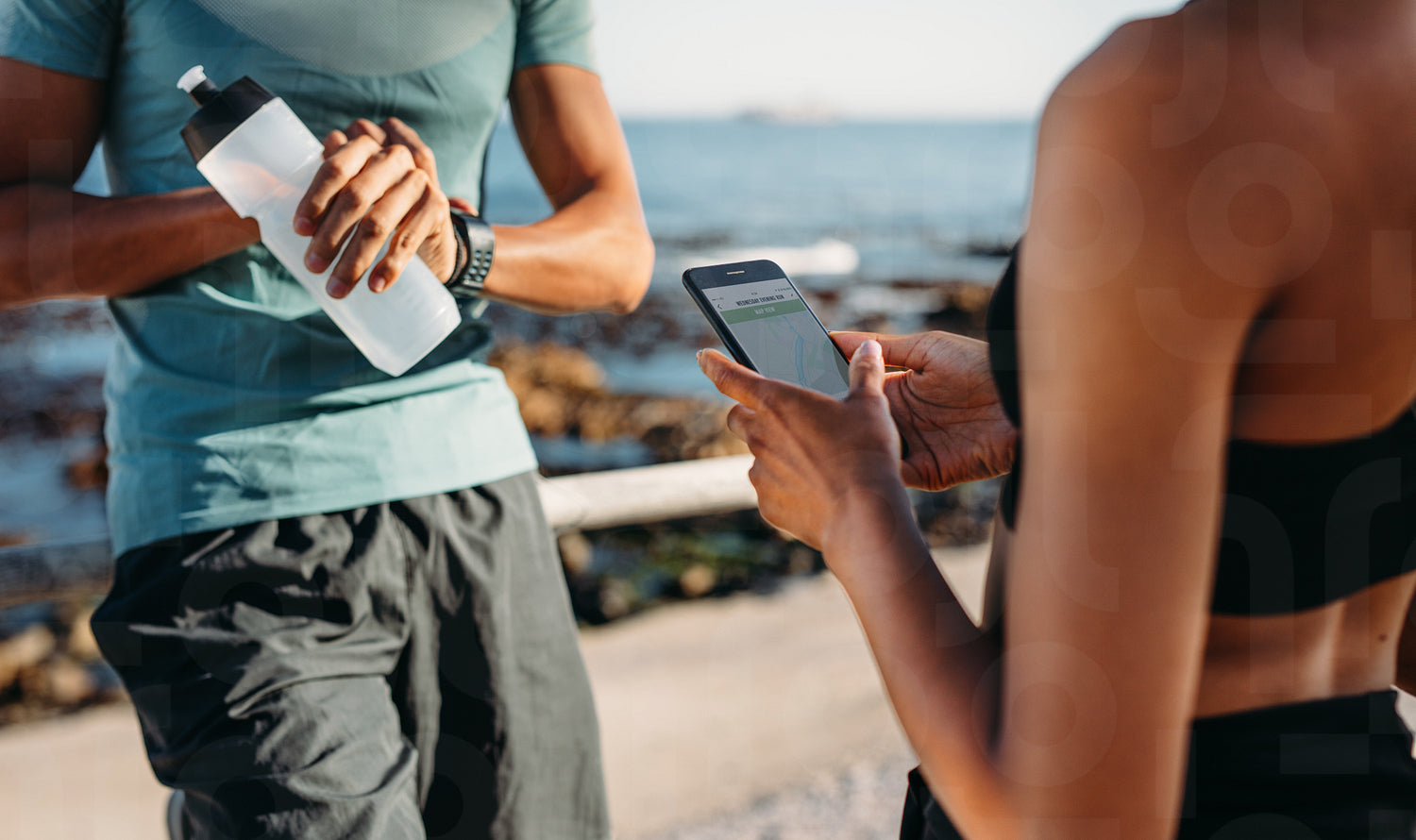Athletic couple standing outdoors together taking a break after running. Man looking at his wrist watch holding a water bottle while his female friend is looking at mobile phone.