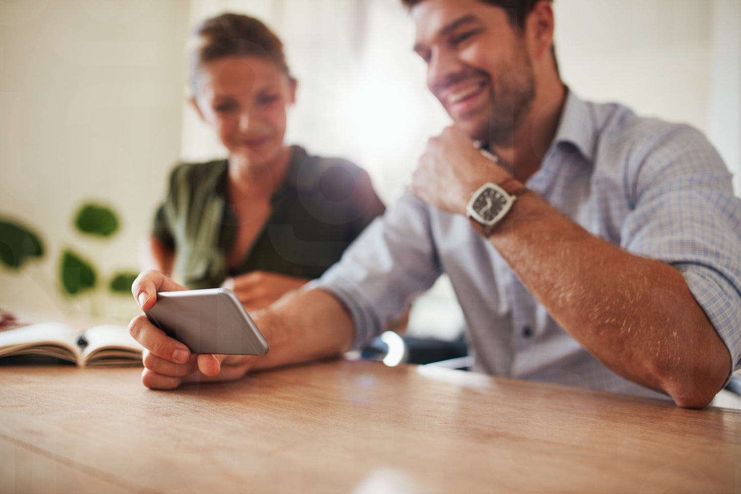 Shot of young couple sitting together at table and using mobile phone. Young man and woman at home using mobile phone. Focus on mobile phone in man hand.
