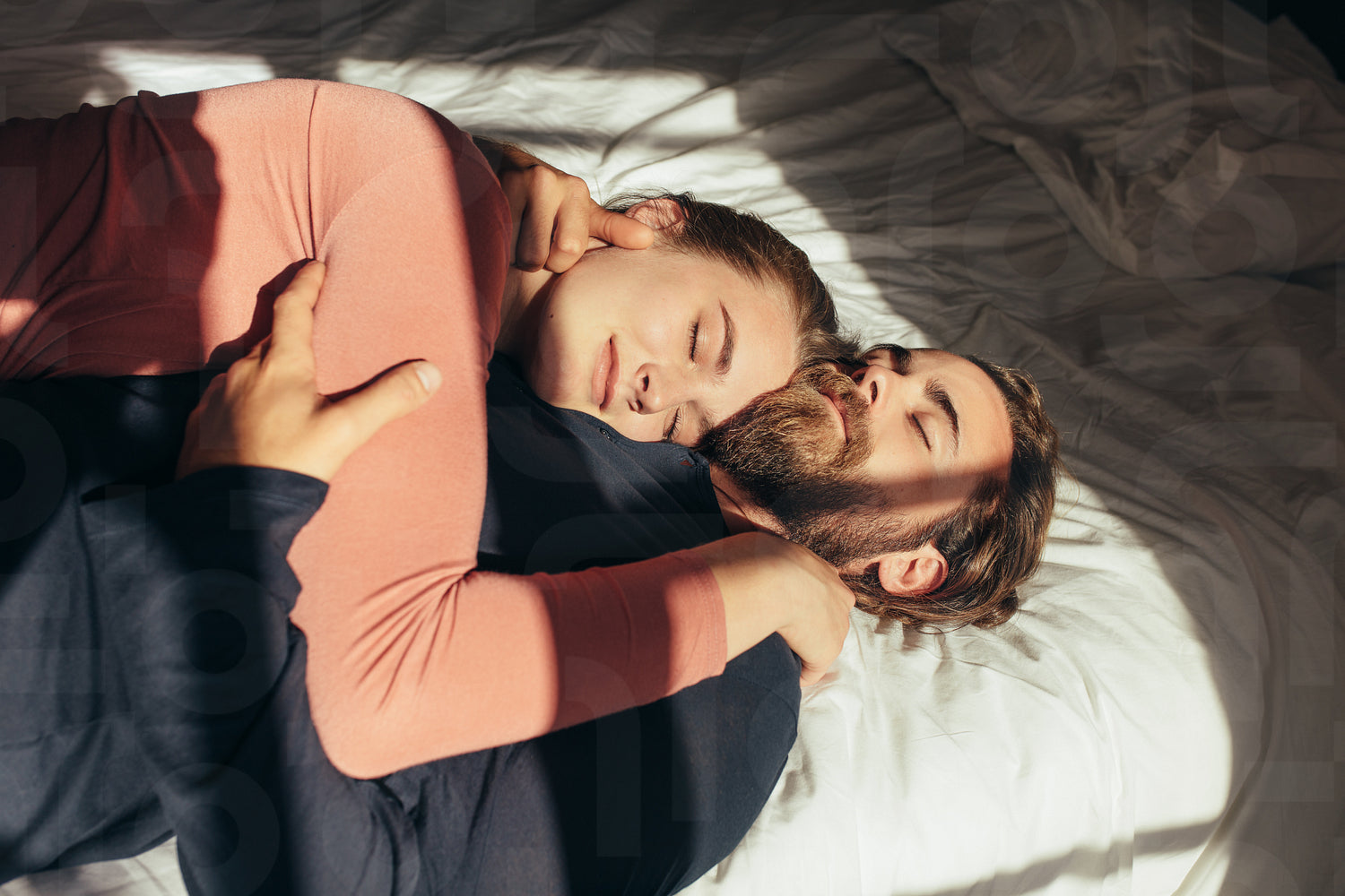 Woman sleeping on arm of her husband with sun light entering from the window. Couple relaxing on bed holding each other with eyes closed.