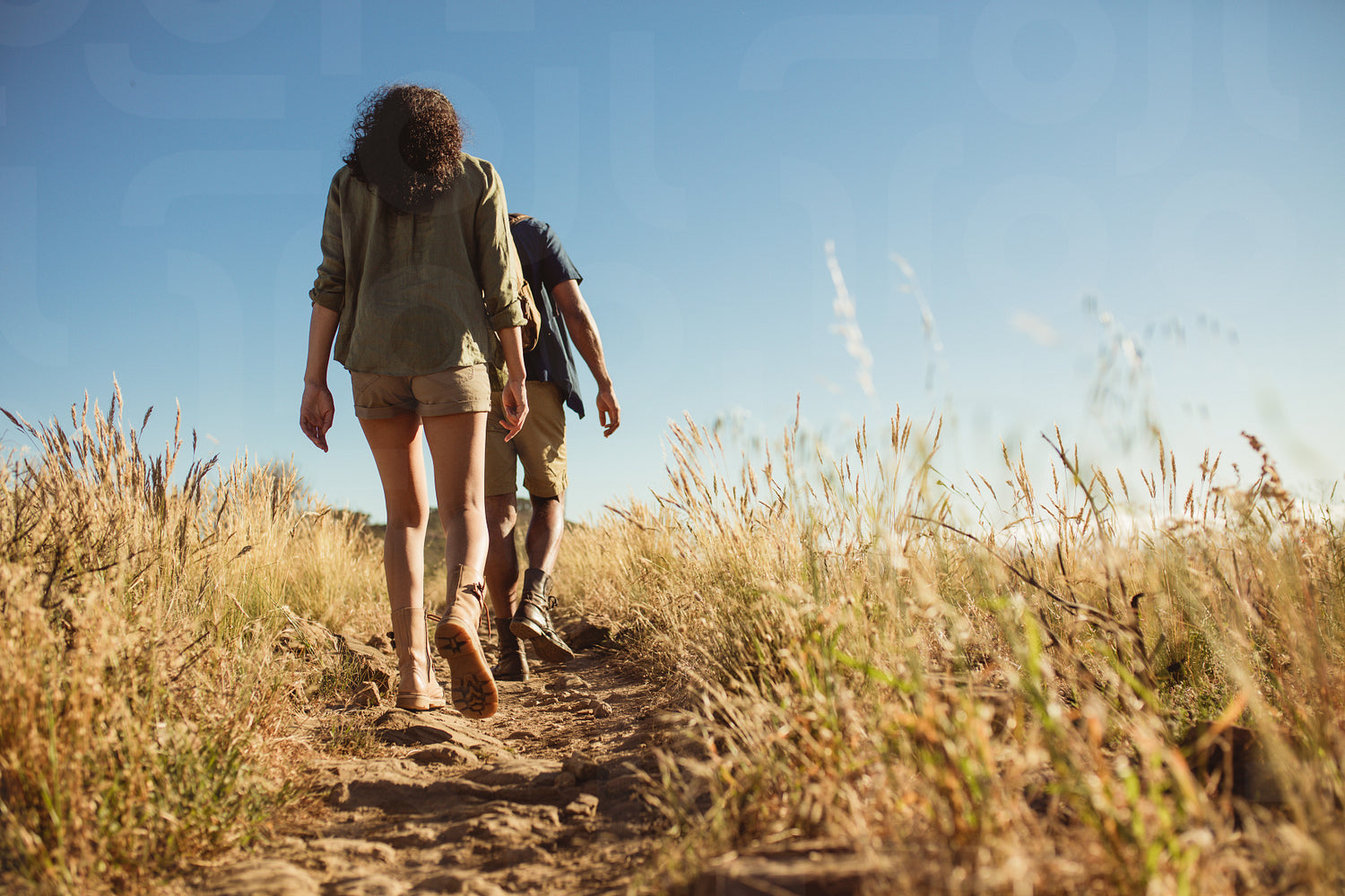 Adventurous couple on a hiking trip on a sunny day. Rear view of a couple walking on a rocky trail.