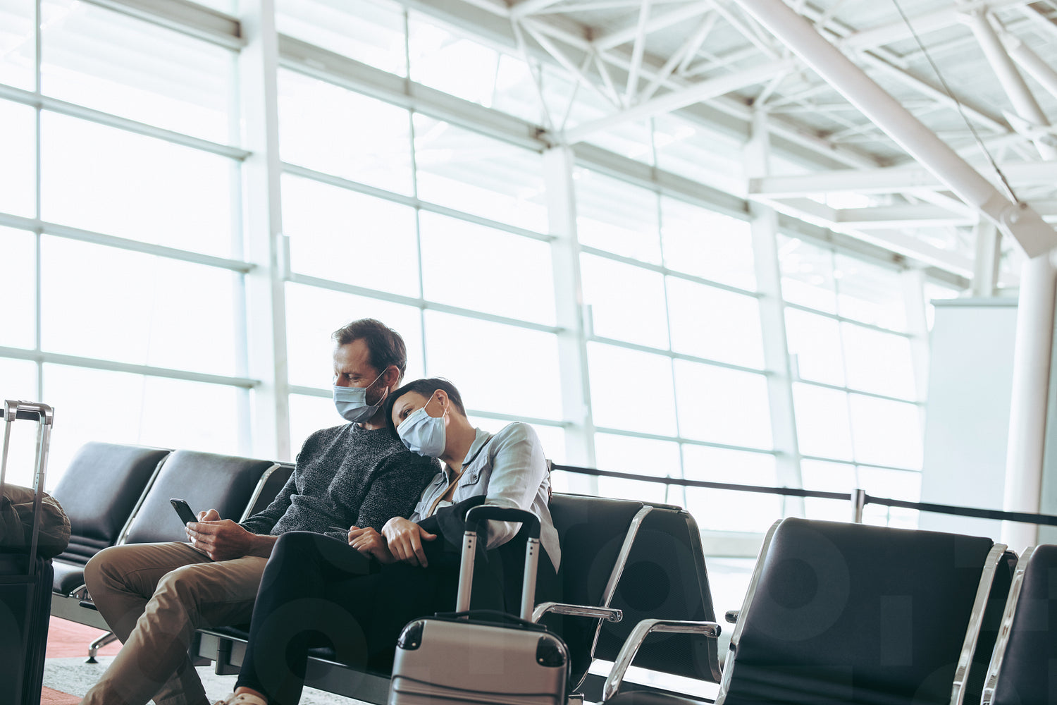 Man and woman with face masks sitting at airport waiting area. Couple at airport during Corona virus lockdown.