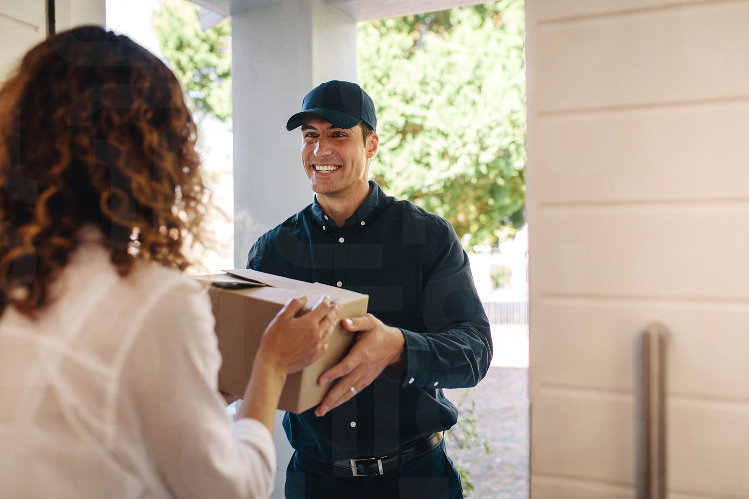 Courier worker delivering a parcel to woman