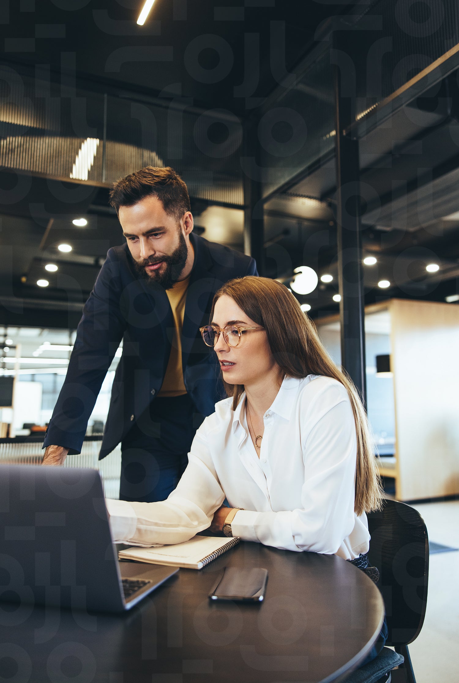 Coworkers having a discussion while working with a laptop in an office. Two focused entrepreneurs collaborating in a modern workspace. Two young businesspeople sitting together at a table.