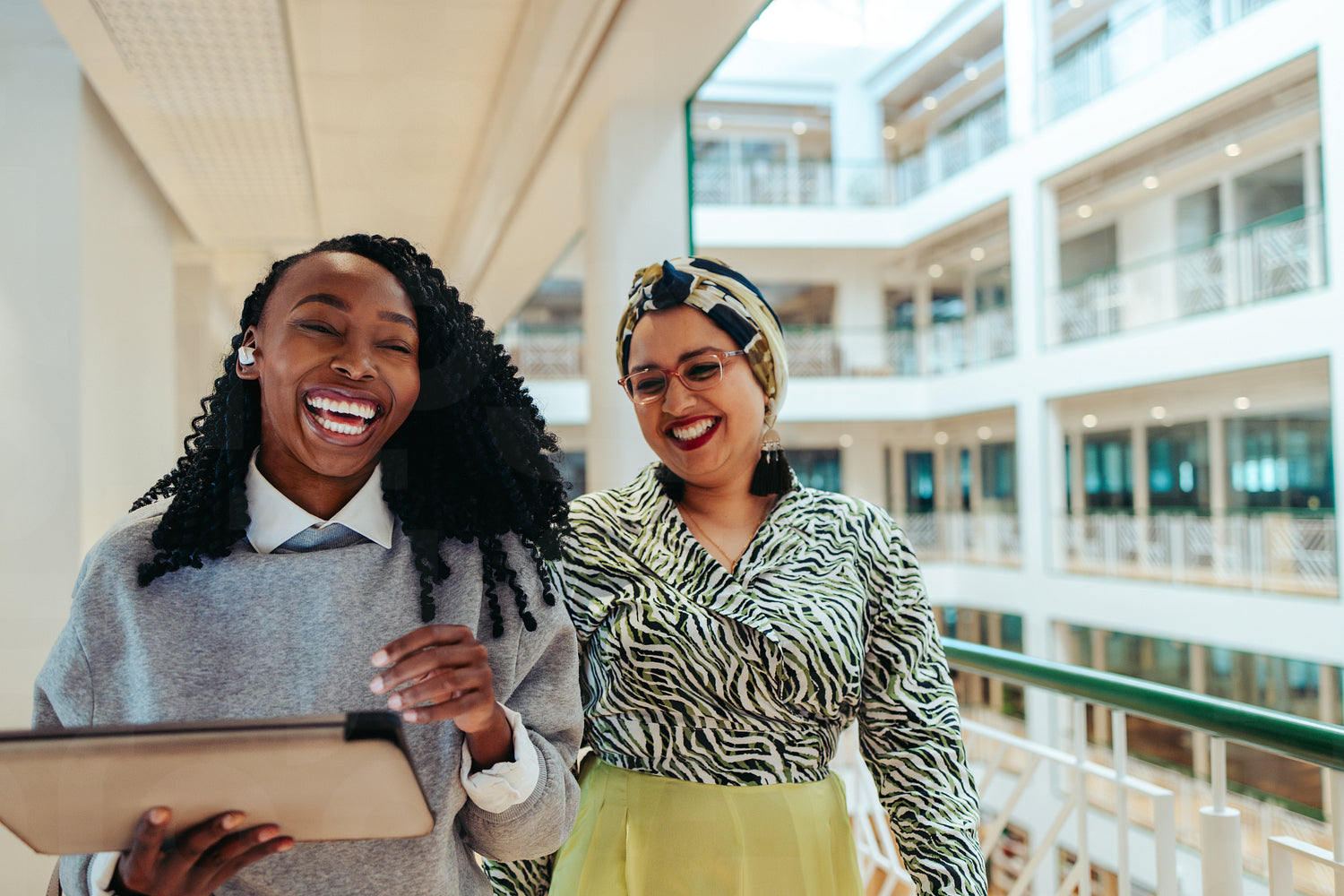 Two coworkers walking through an office building while laughing and enjoying each other's company. The ambiance is lively and friendly, capturing a positive work environment.