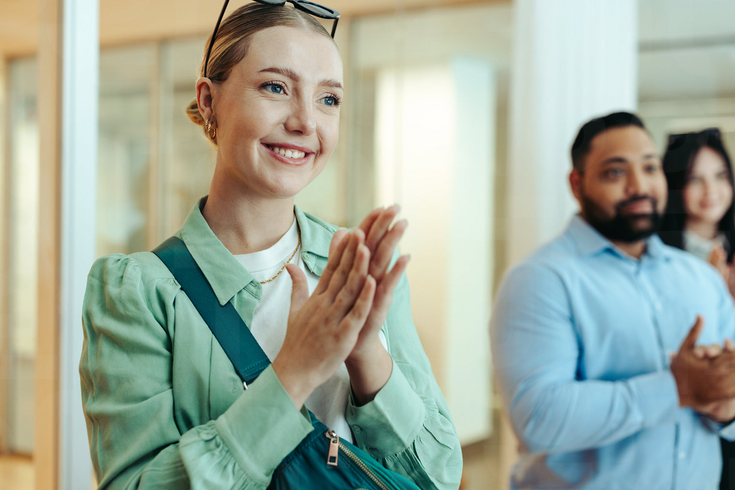 A professional woman claps enthusiastically in a creative agency meeting, exuding positivity and teamwork spirit. The setting showcases a collaborative work environment.