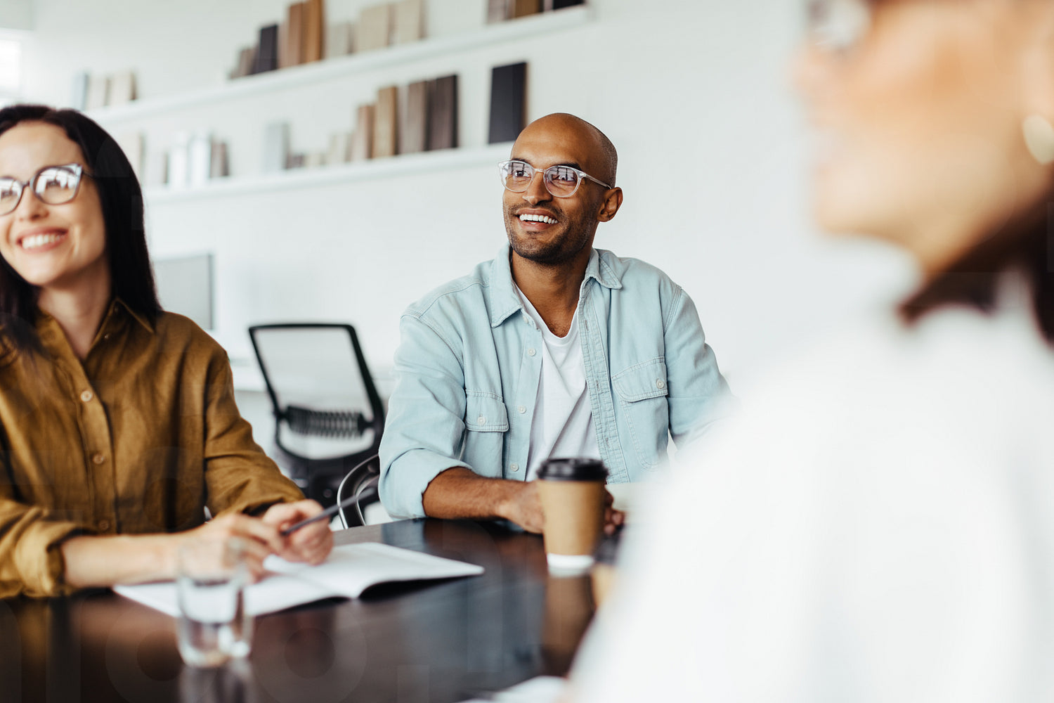 Creative business people listening to a discussion in a meeting. Group of diverse business professions sitting at a table in an office.