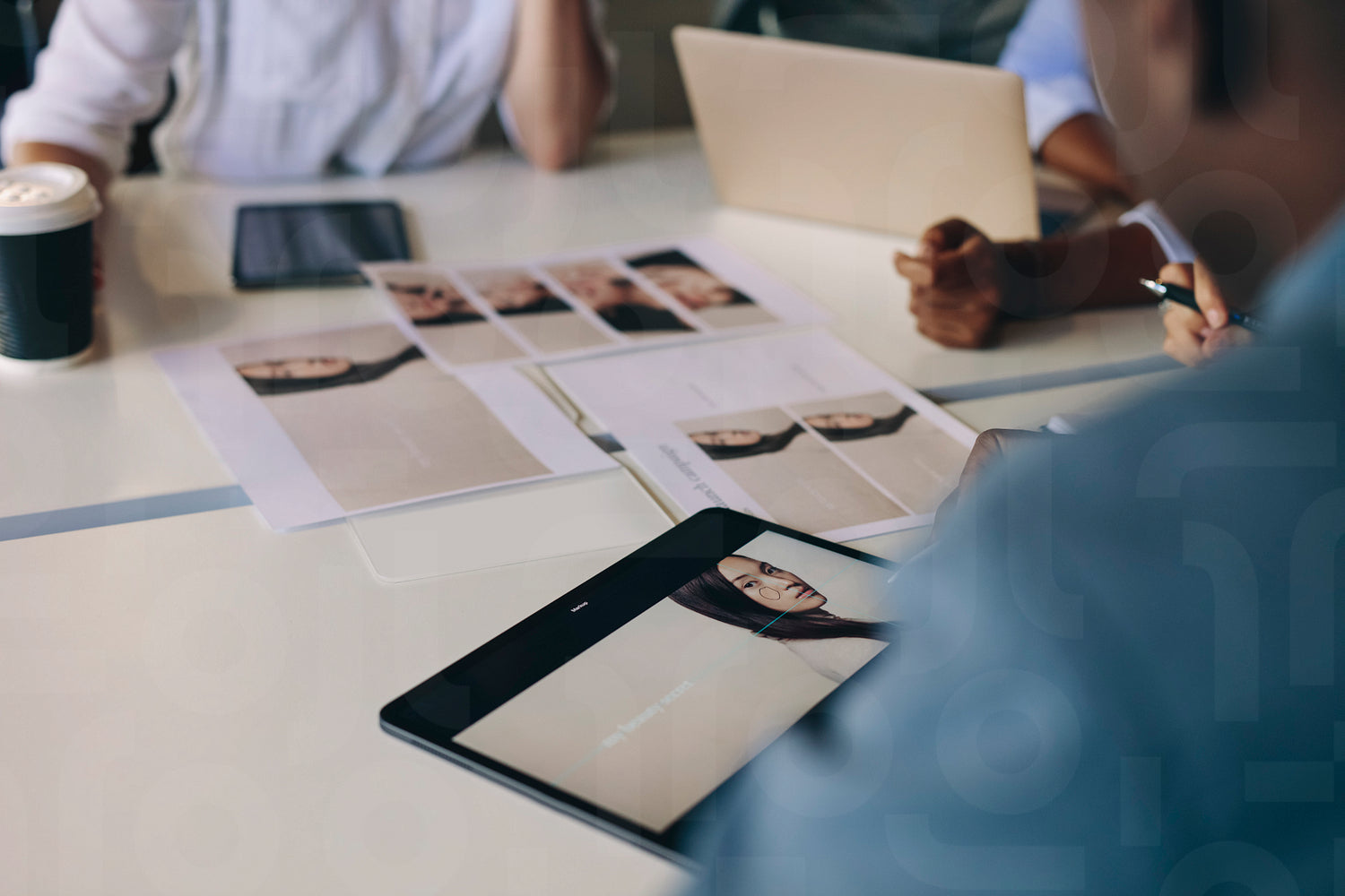 Group of business people selecting material for a project sitting around a table with photo on digital tablet and photo prints.
