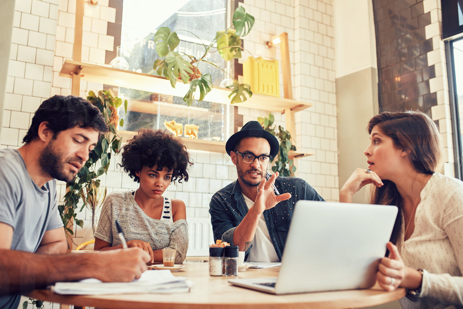 Portrait of creative business team sitting at a coffee shop with laptop. Young man discussing new business ideas with colleagues at a cafe.