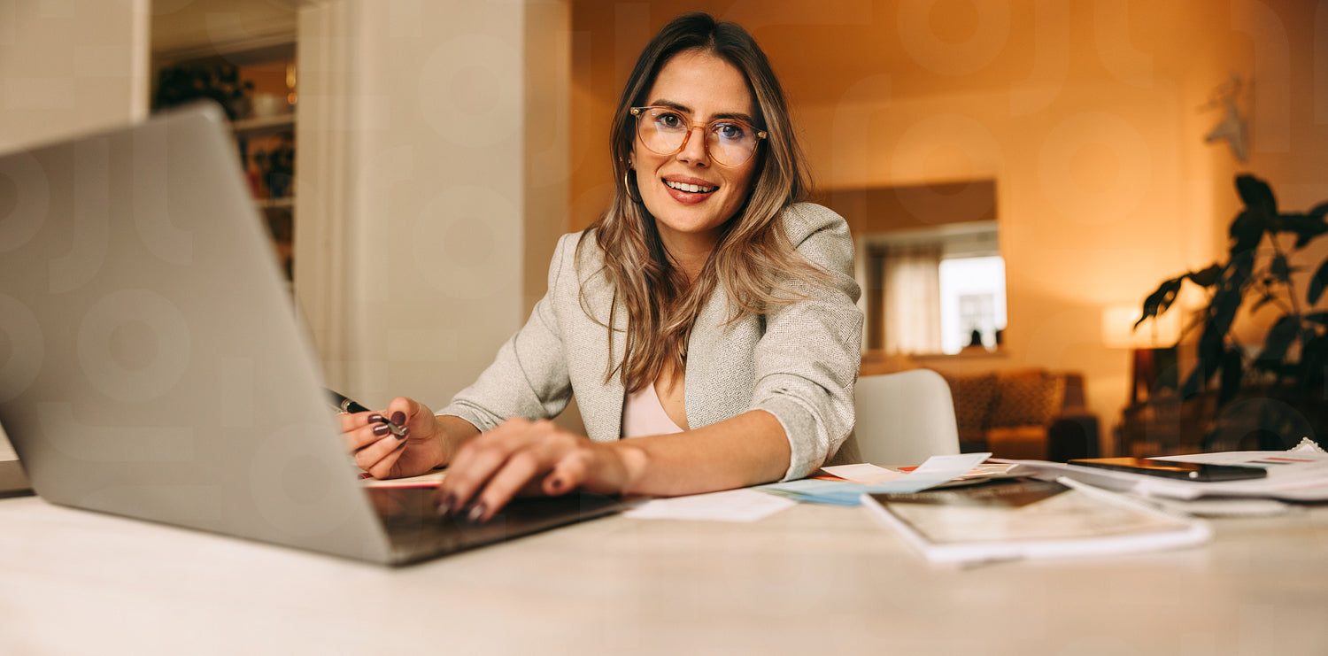 Creative businesswoman working in her home office. Happy female designer looking at the camera while sitting at her desk. Cheerful interior designer planning a new project while working remotely.