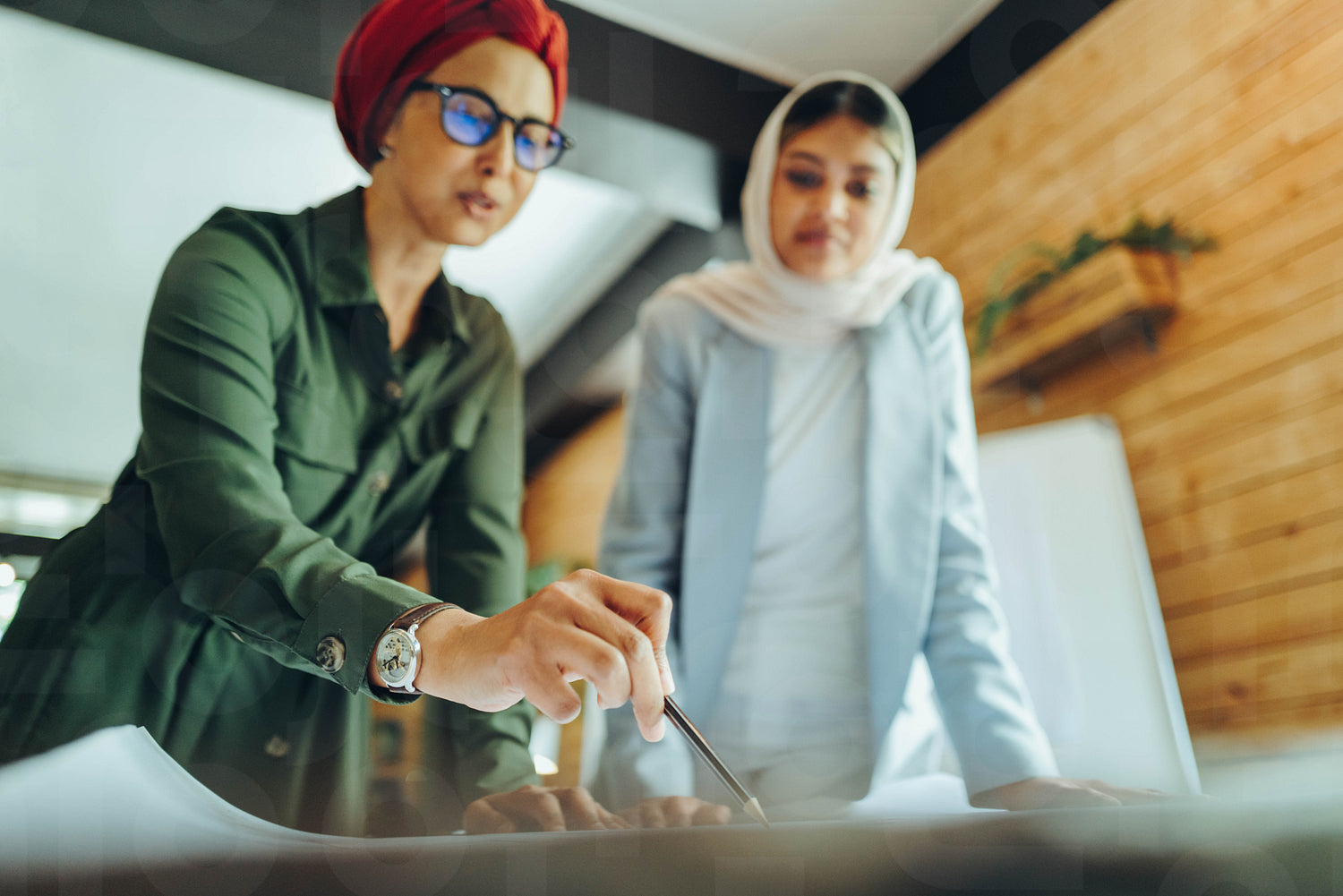 Creative Muslim architects working on blueprint drawings in a modern office. Two businesswomen planning a new innovative project. Two female designers wearing headscarfs in an inclusive workplace.