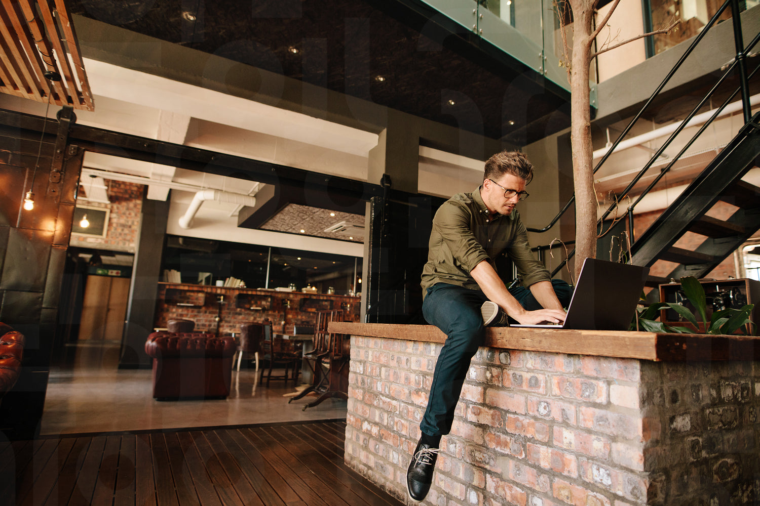 Shot of creative professional working on laptop. Young man in office cafe using laptop computer.