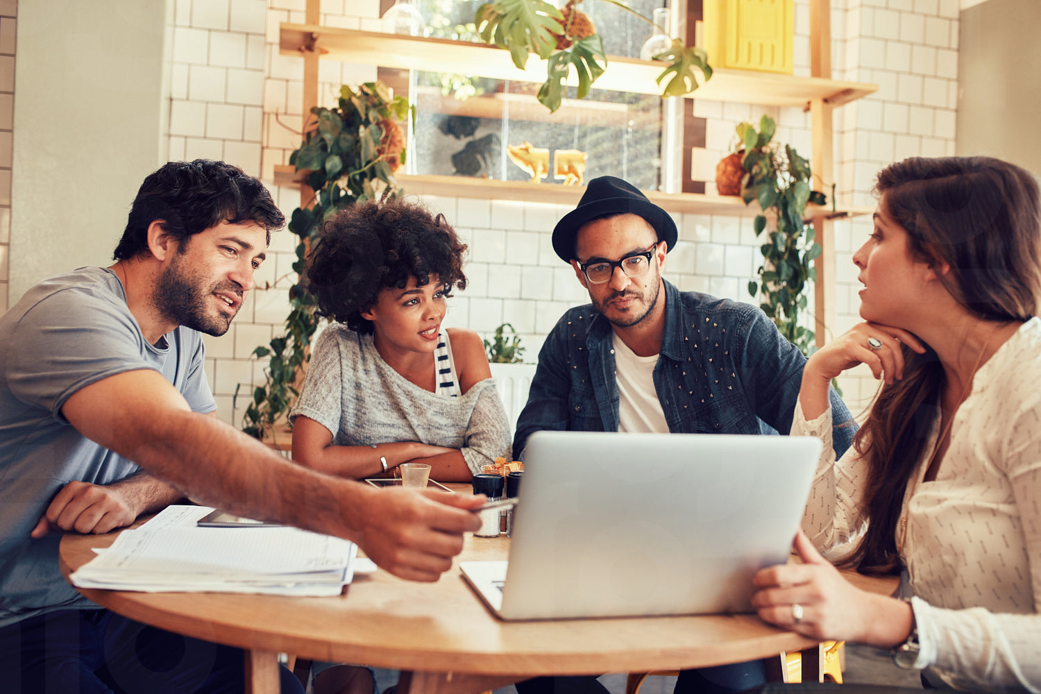Portrait of young people sitting around a table in cafe with a laptop. Creative team discussing new business project at a coffee shop.