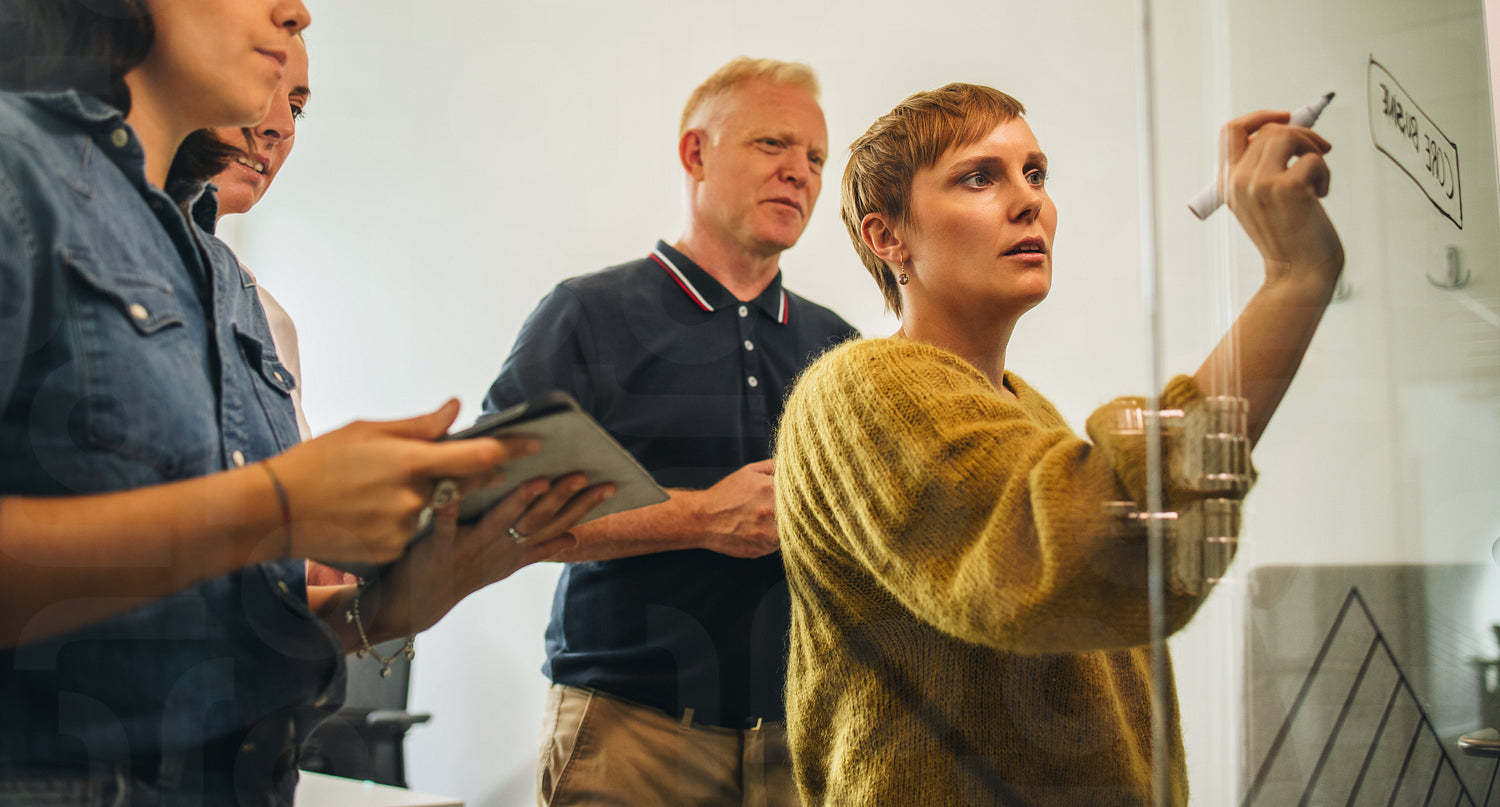 Creative business people brainstorming new ideas for project. Project management team collaborating on project.