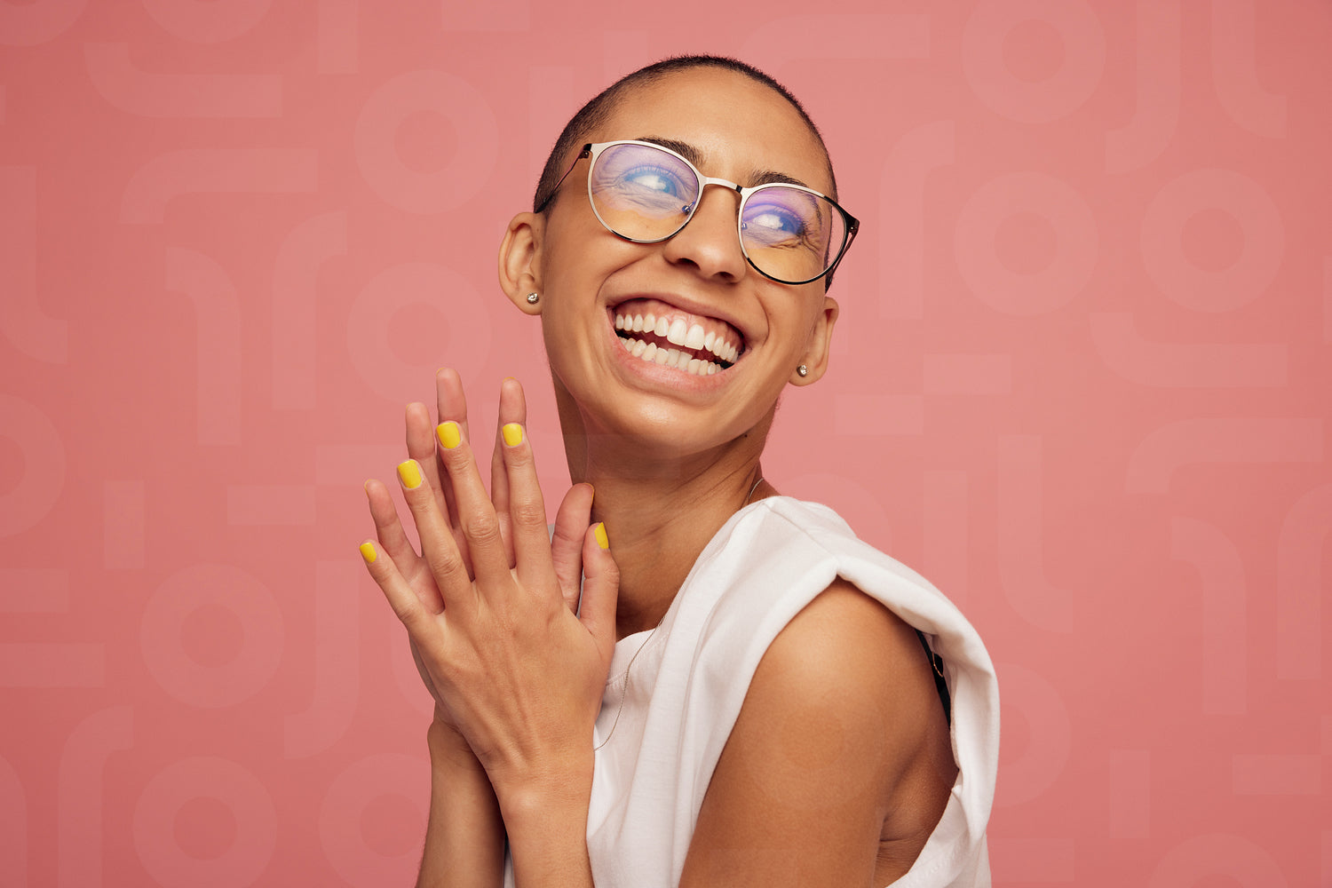 Woman with shaved head looking away and smiling. Smiling female with short hair wearing eye glasses.