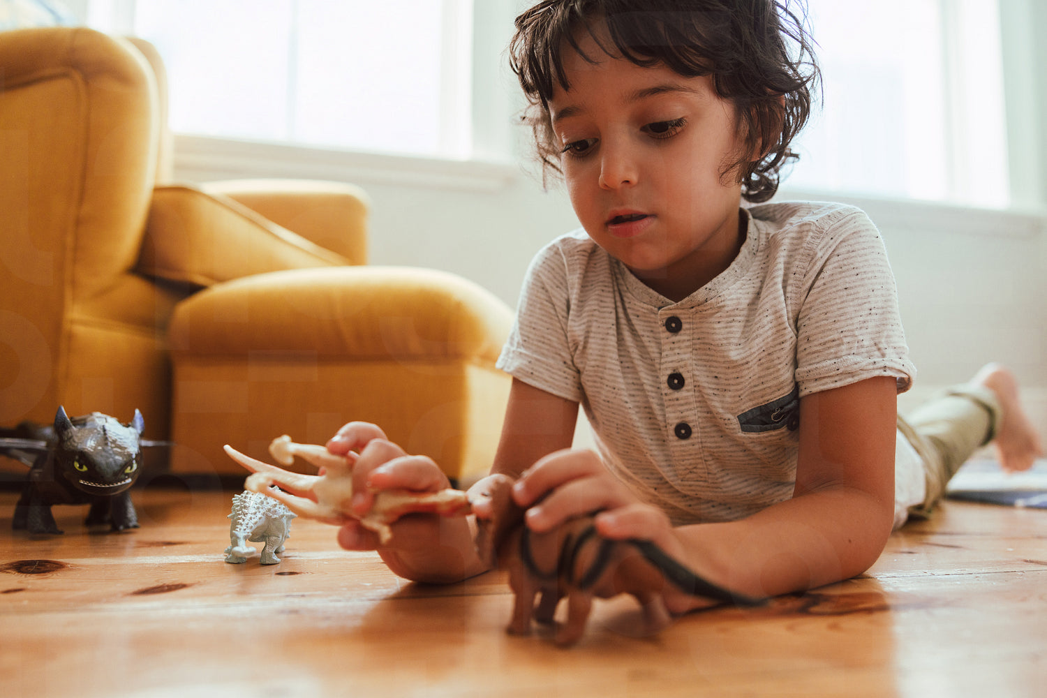 Creative young boy playing with dinosaur toys