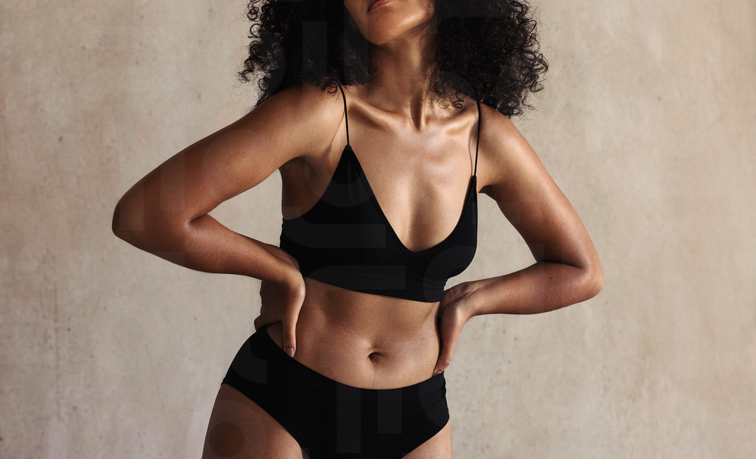 Cropped shot of an unrecognizable young female model. Confident young black woman wearing black underwear and embracing her natural body. Woman standing alone against a studio background.