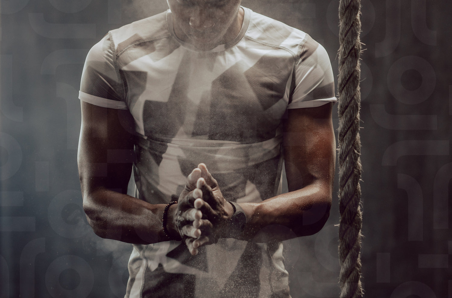 Athletic man chalking his hands before climbing a rope at the gym. Man standing beside a hanging rope applying gripping powder to his hands.