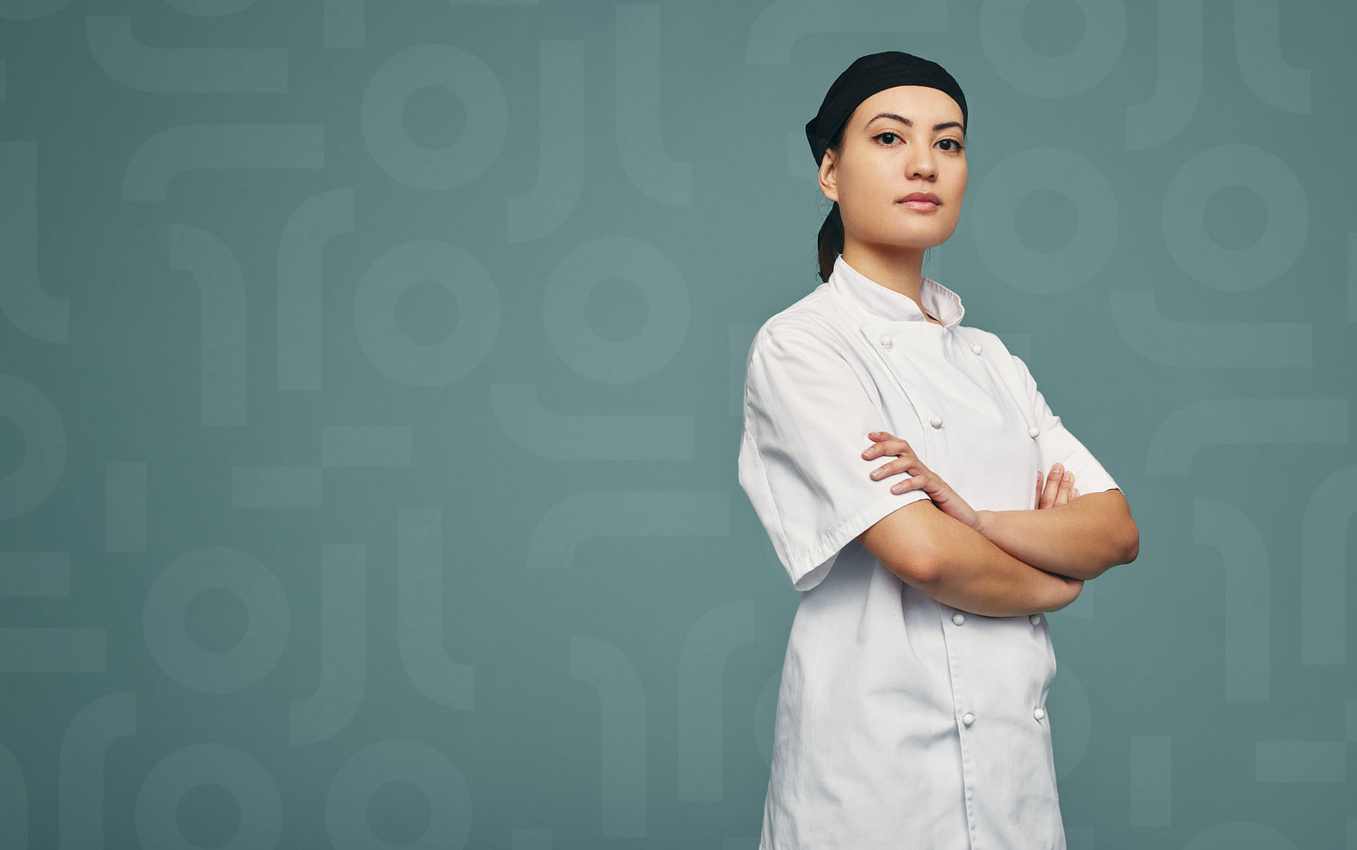 Culinary chef looking at the camera while standing with her arms crossed in a studio. Professional cook wearing a white coat and a black bandana against a studio background.