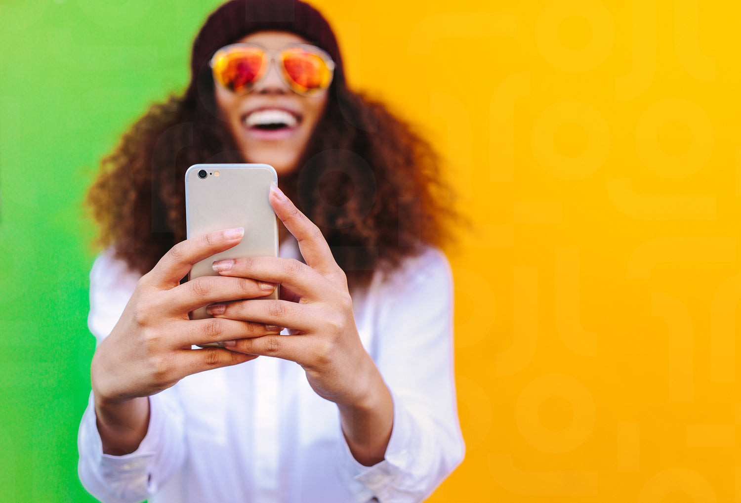 Curly haired african girl taking a selfie using smartphone. Focus on mobile phone in hand of woman taking selfie on yellow and green background.
