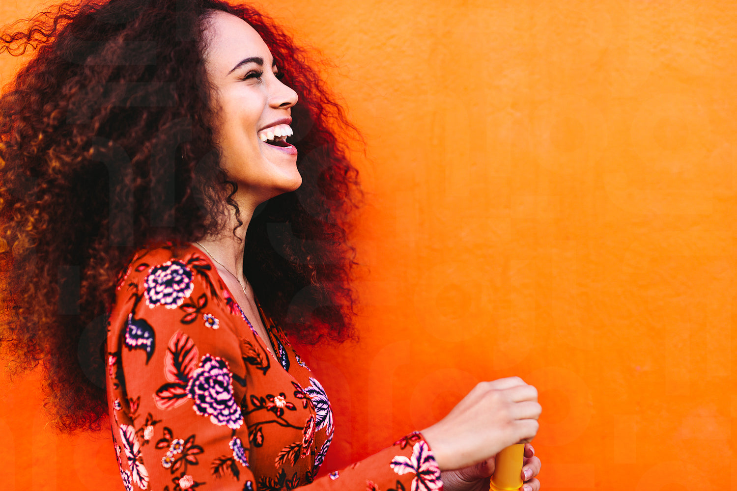 Side view shot of attractive female with soap bubbles. Young woman having fun against orange background.