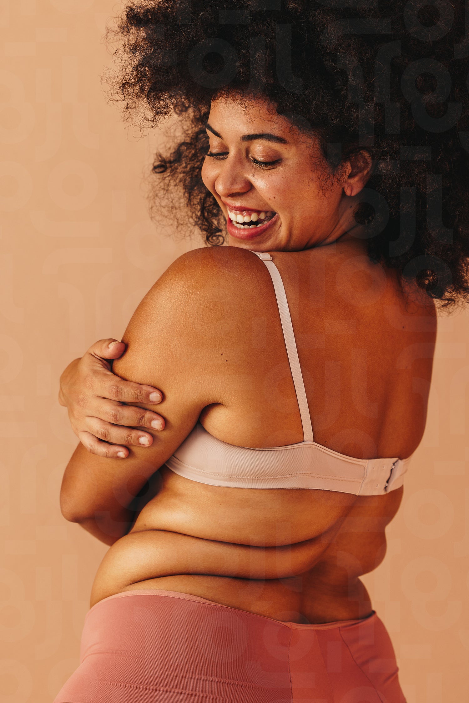 Plus size woman looking at her body with a cheerful smile while wearing underwear. Body positive woman with an Afro hairstyle embracing her natural body and curves.
