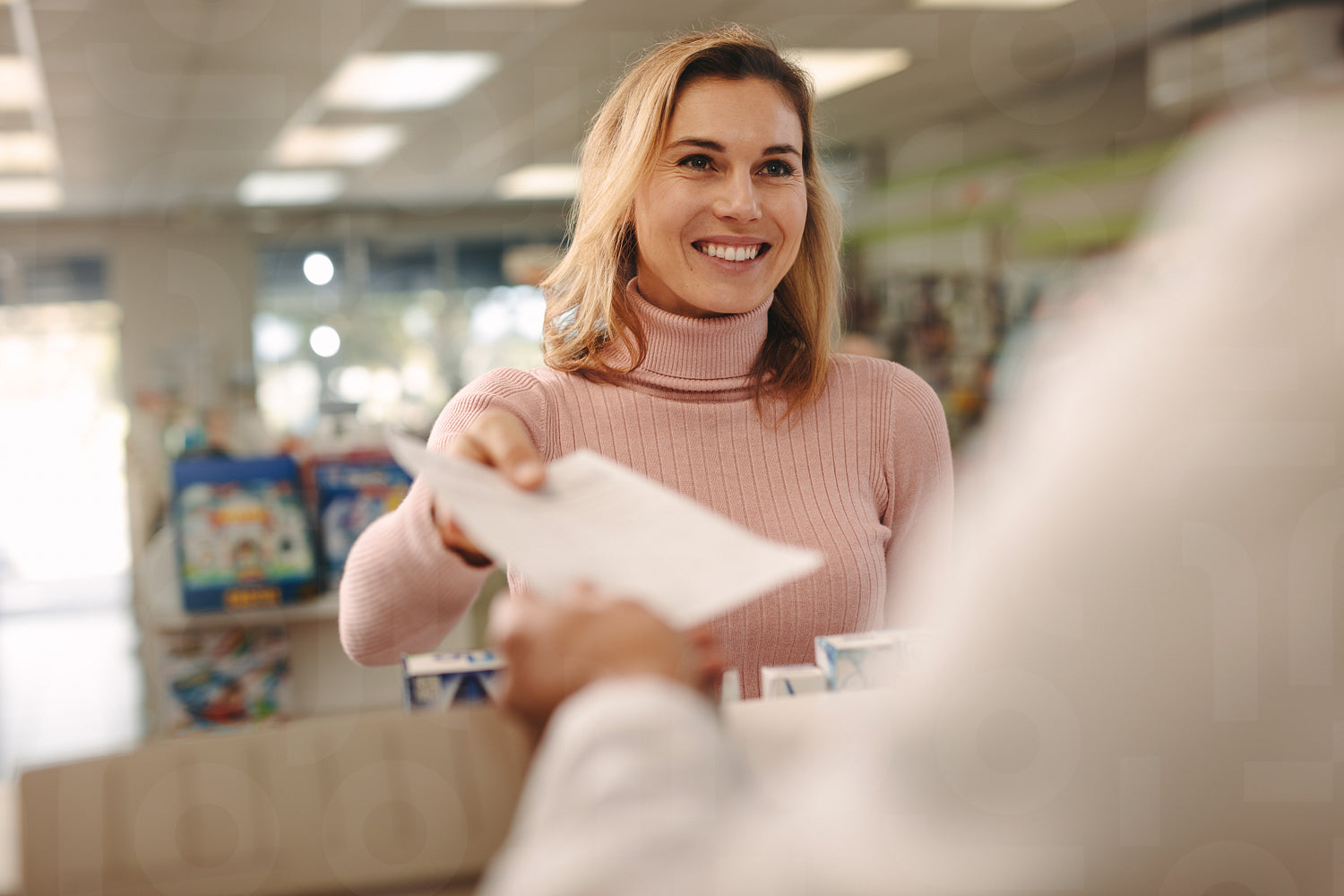 Customer giving a prescription to the chemist standing at counter. Woman standing at medical store counter and handing a prescription to pharmacist.