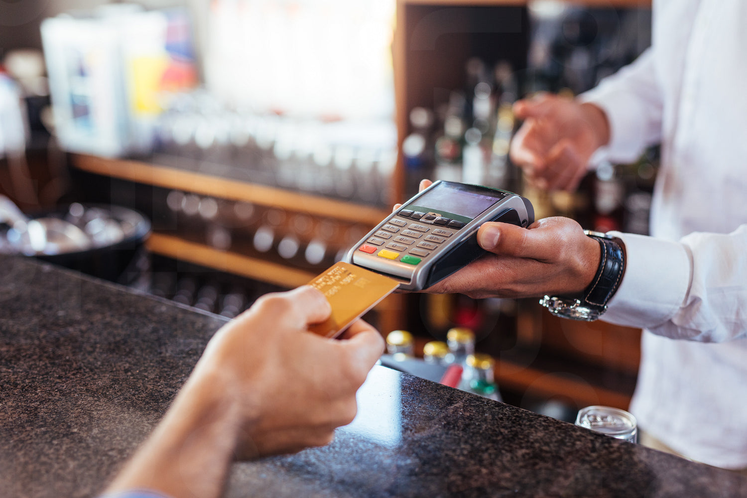 Customer making payment using credit card. Close up of card payment being made between customer and bartender in cafe.