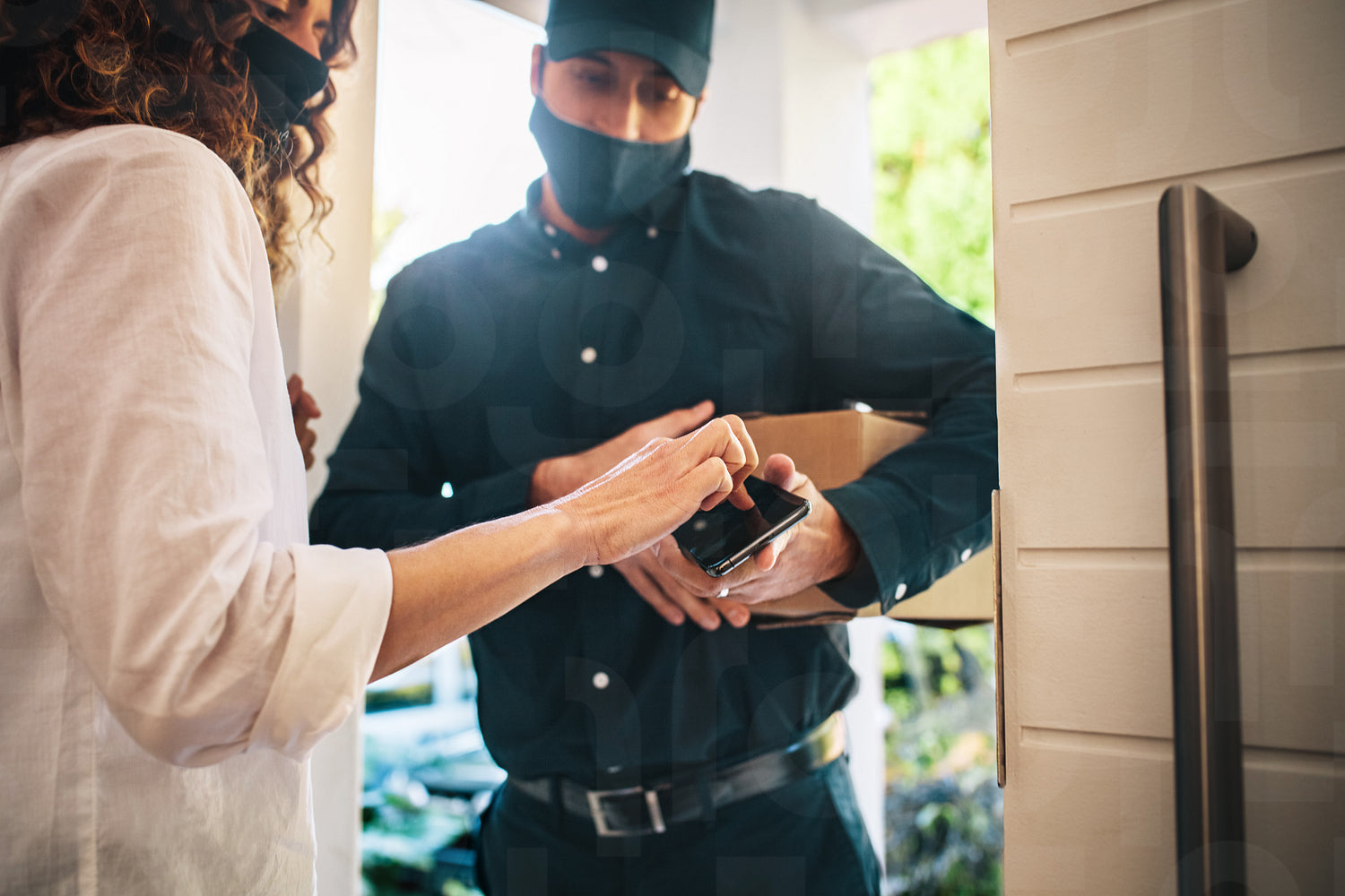 Delivery man with face mask holding smartphone while female customer signing on touch screen receipt of home delivery package.
