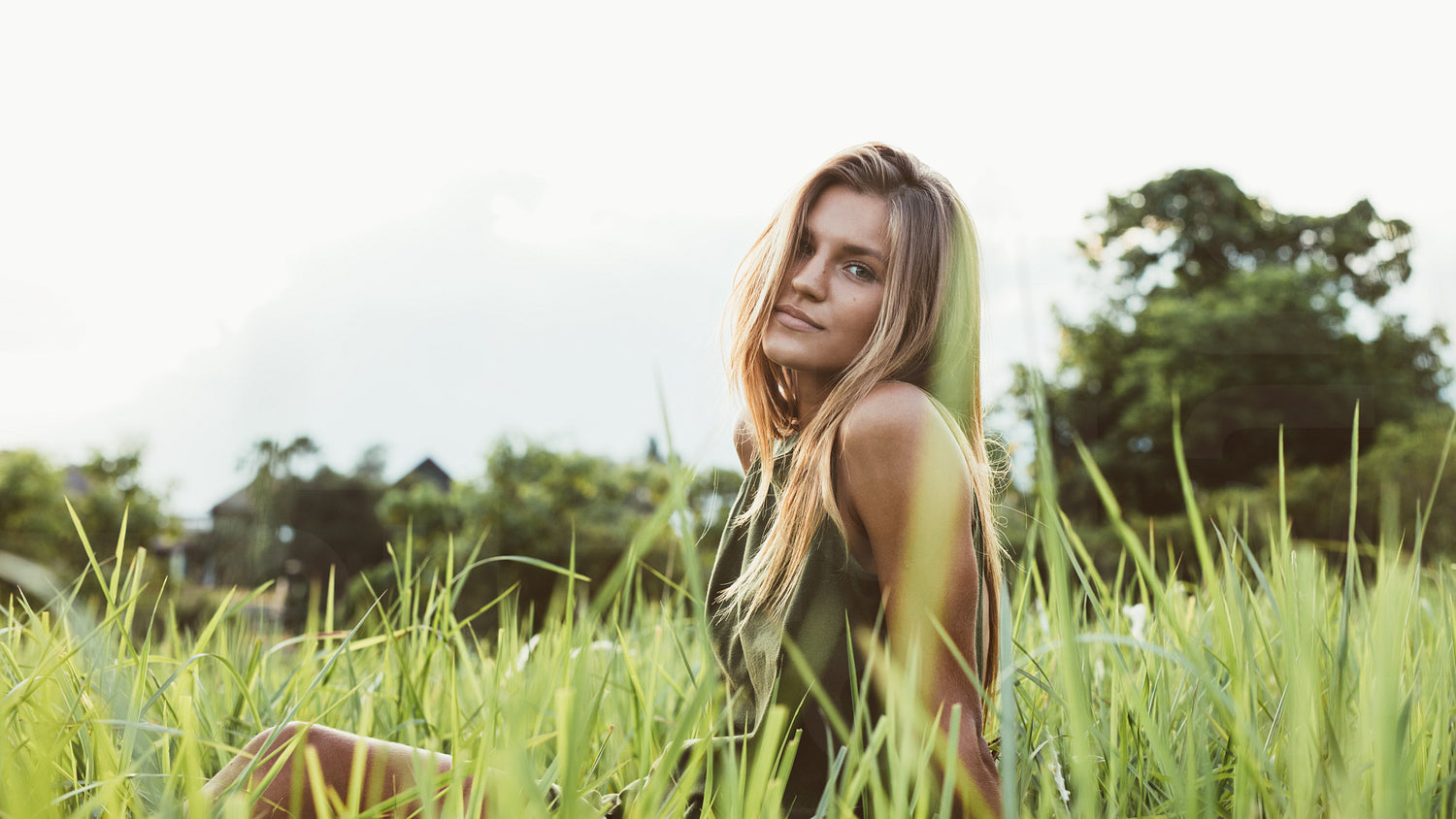 Portrait of cute young female model sitting in the meadow. Caucasian young woman outdoors in the field and looking at camera.