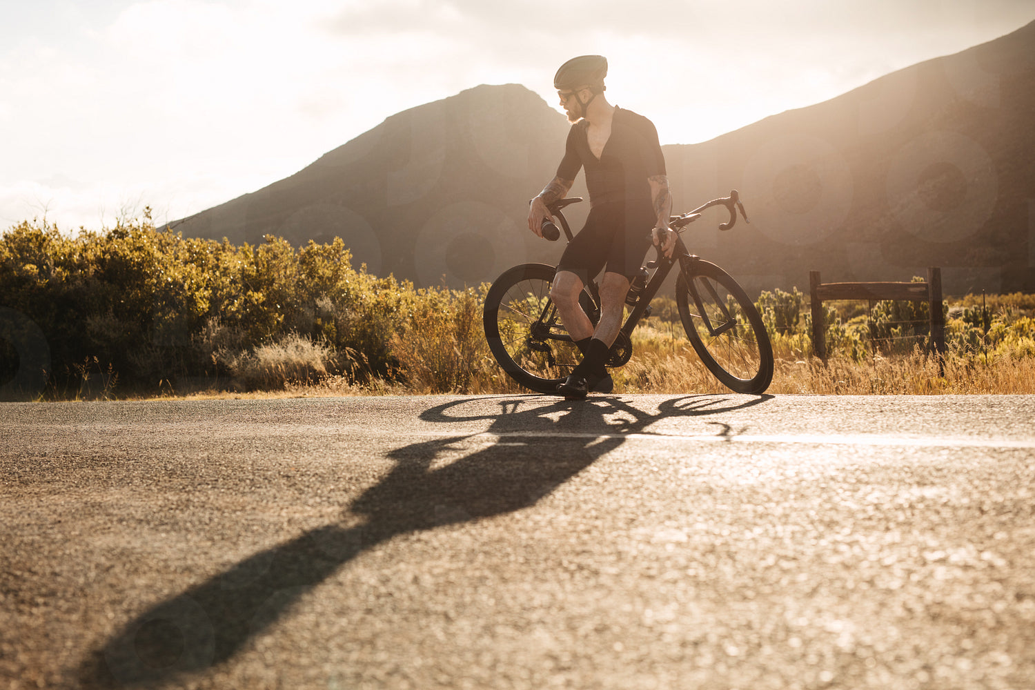 Professional male cyclist standing and leaning on his bike on countryside road. Male cyclist taking rest during training on country road.