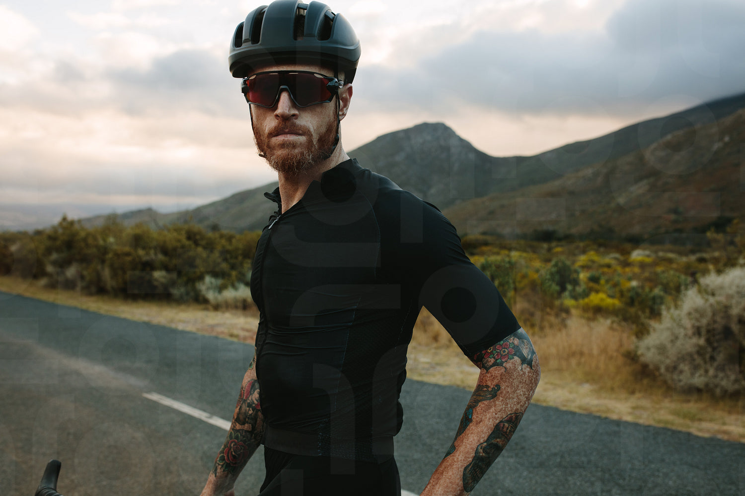 Cyclist with bicycle standing outdoors