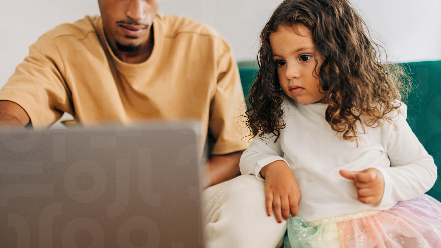 Dad showing his daughter an educational video on a laptop at home. Single father homeschooling his young daughter using children's programmes. Father and daughter sitting together on a couch.