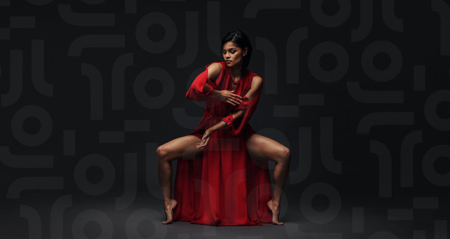 Female dancer performing contemporary dance style. Woman in red dress dancing on black background.