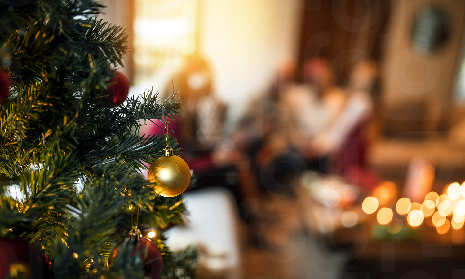Close up of decorated christmas tree at home with family sitting in background