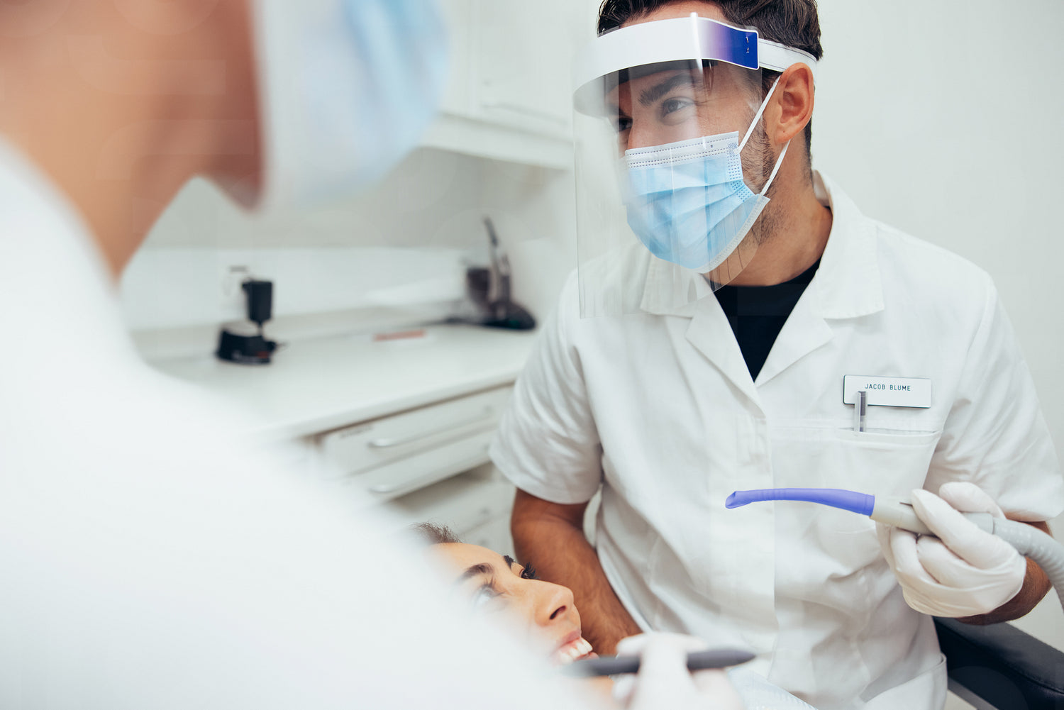 Doctors wearing face shields talking between the dental treatment of a female patient. Male dentist holding suction tube discussing with his assistant during treatment.