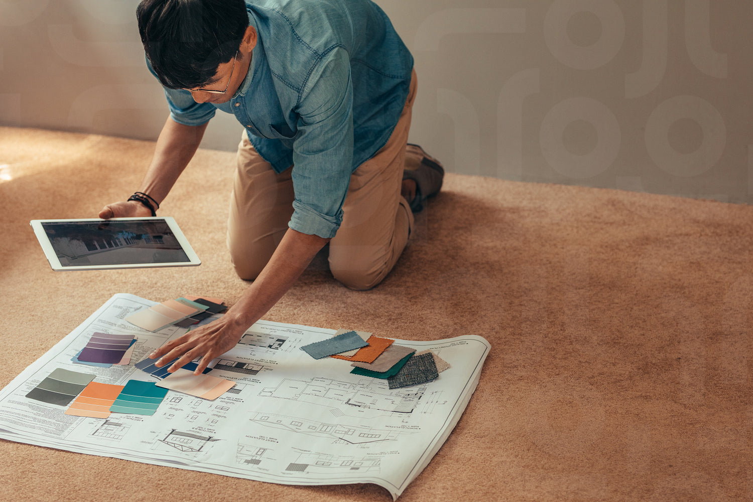 Man holding digital tablet on floor with housing plan and color swatches. Designer selecting color scheme for new house project.