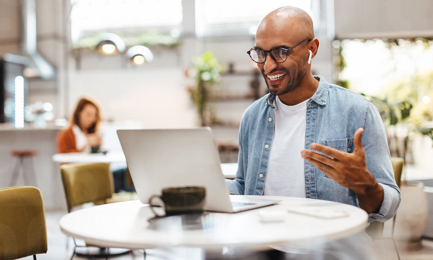 Happy digital nomad connects with his colleagues over a video call in the atmosphere of a trendy coffee shop, discussing projects and exchanging ideas as they collaborate remotely.