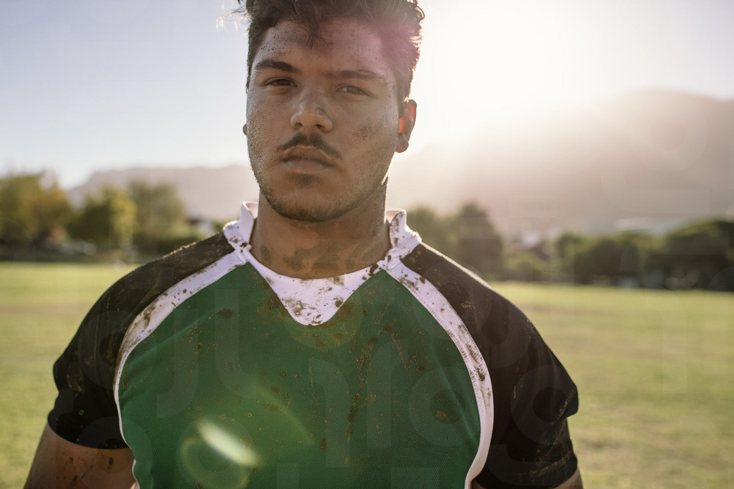 Rugby player on the sports field. Young sportsman with face and uniform smeared in mud with bright sunlight.