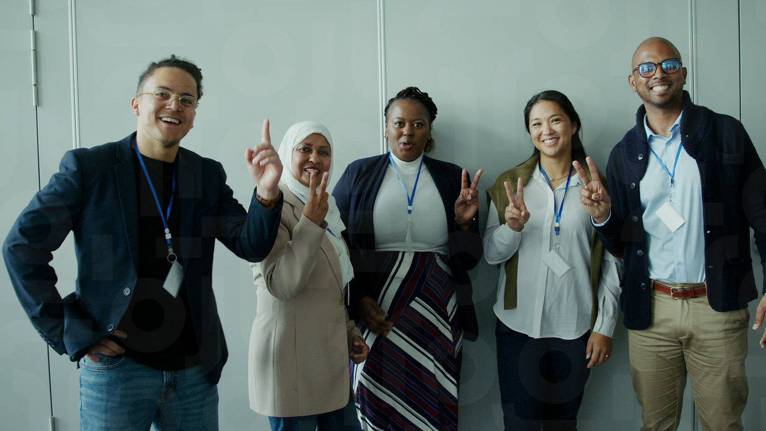 A diverse group of smiling business professionals wearing lanyards, celebrating success, and sharing happy moments at a corporate conference. They radiate positive energy and unity.