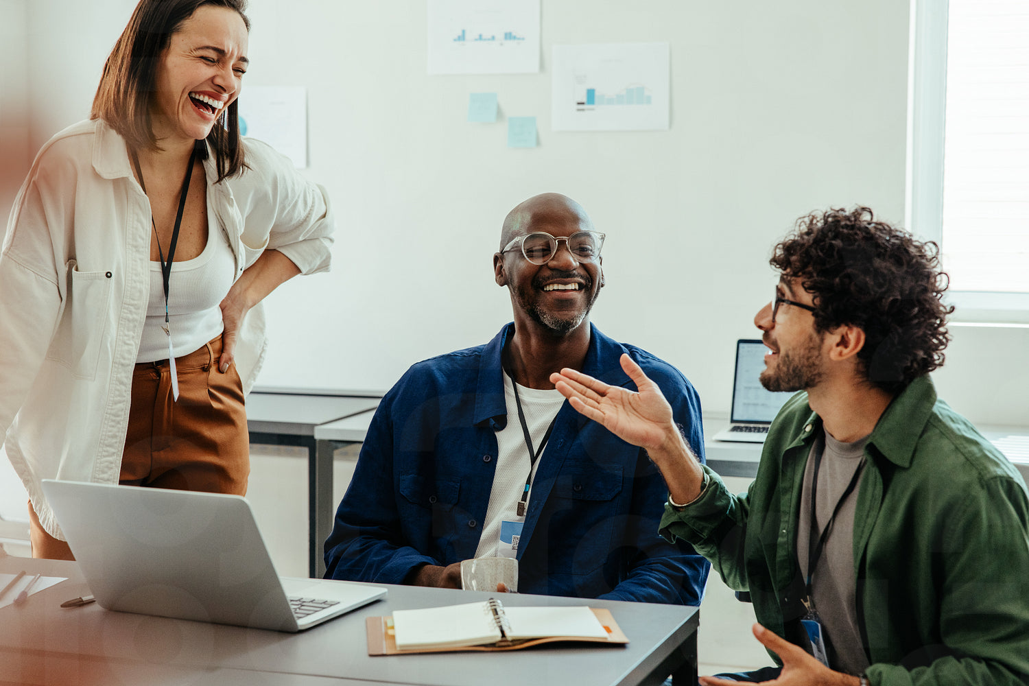 Diverse colleagues gathered in an office enjoying a meeting, collaborating, and brainstorming with laughter and engagement