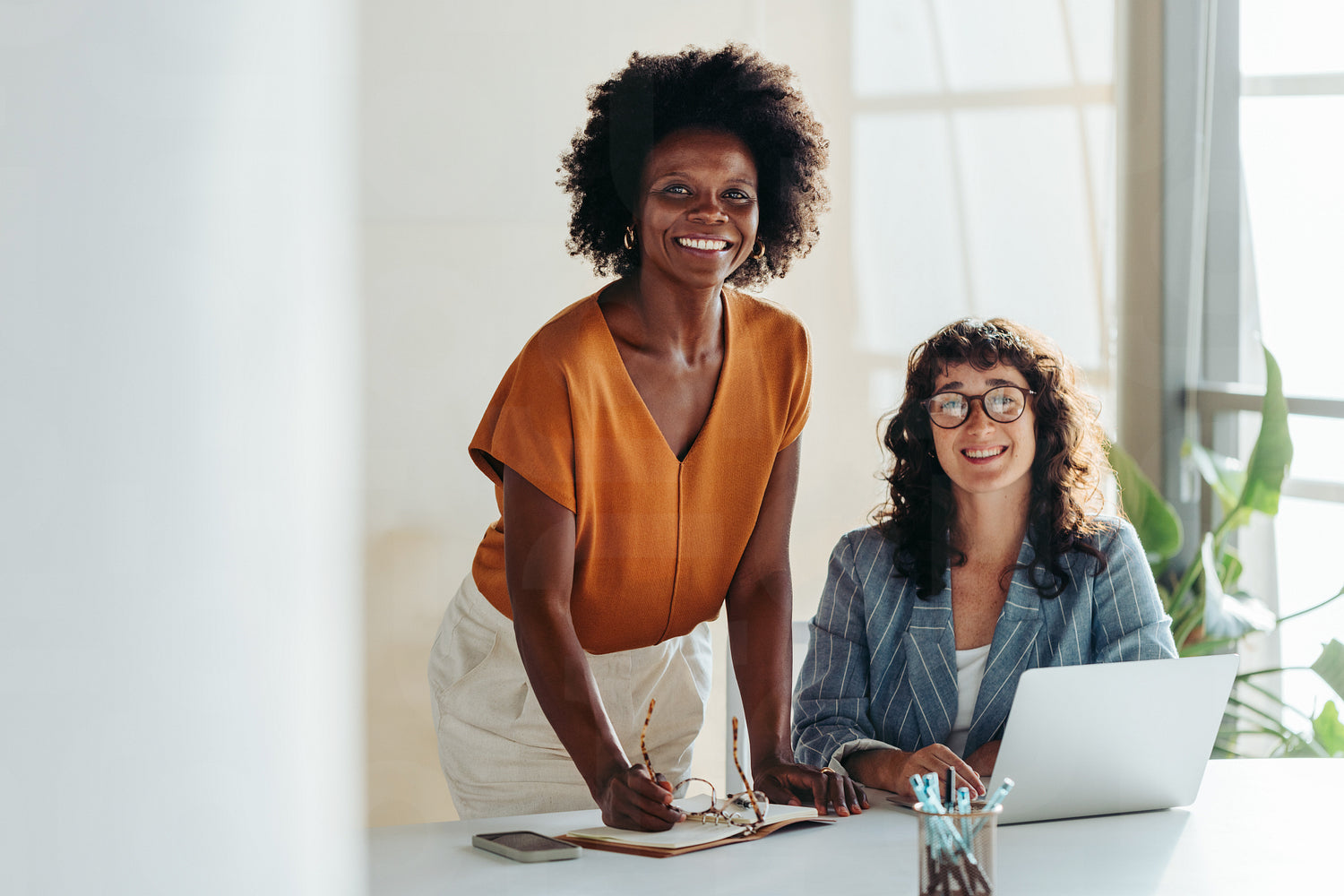 Happy professional women, with one standing and one sitting, collaborate with positive energy in an open office environment. They display a productive partnership with a focus on teamwork.
