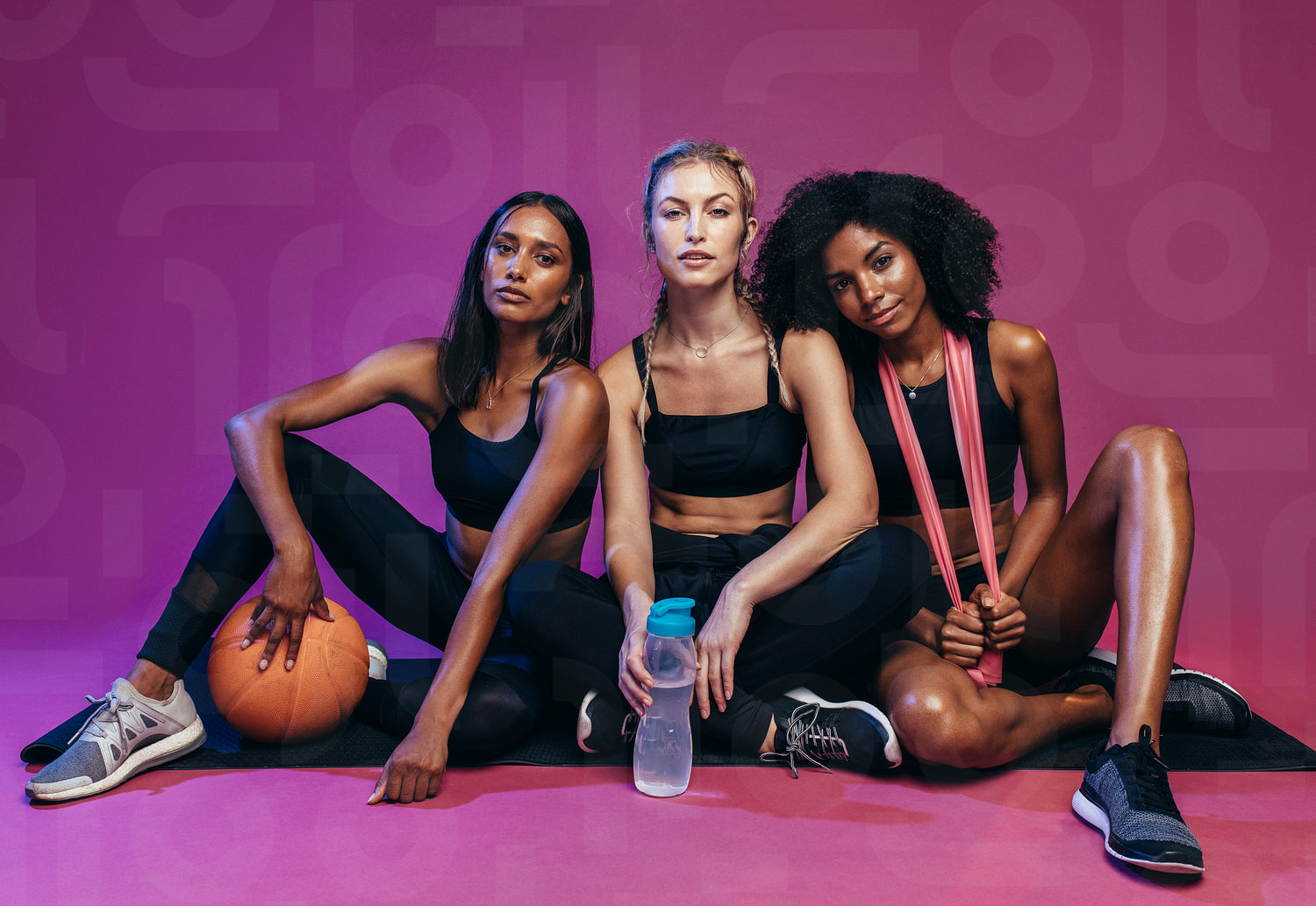 Diverse group of fitness women sitting together in studio and looking at camera. Multi-ethnic group of female friends in sports clothing sitting on colored background with basketball, water bottle and resistance bands.