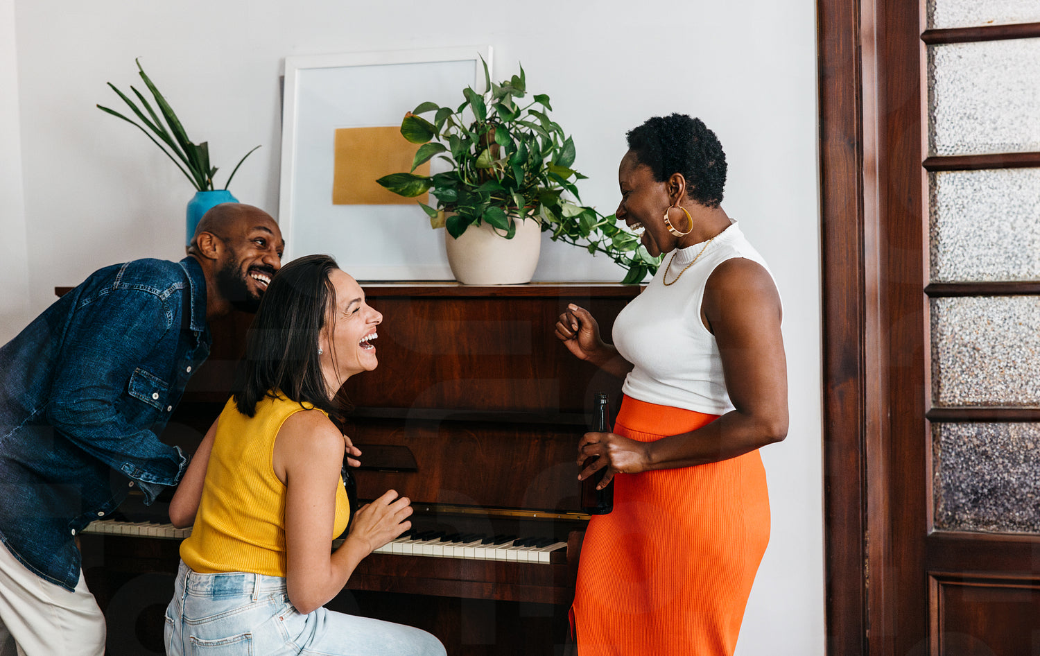 Diverse group of friends enjoying laughter and music around a piano. Cheerful atmosphere with smiling faces and warm friendship.