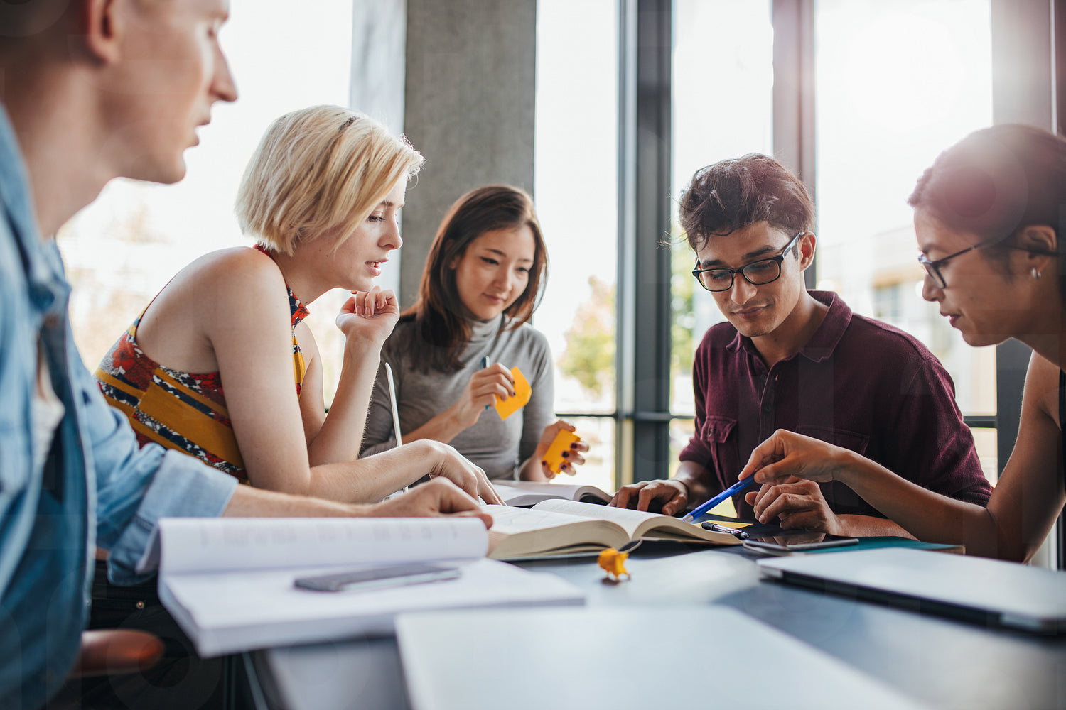 Diverse group of young people sitting at table reading books. University students in cooperation with their assignment at library.