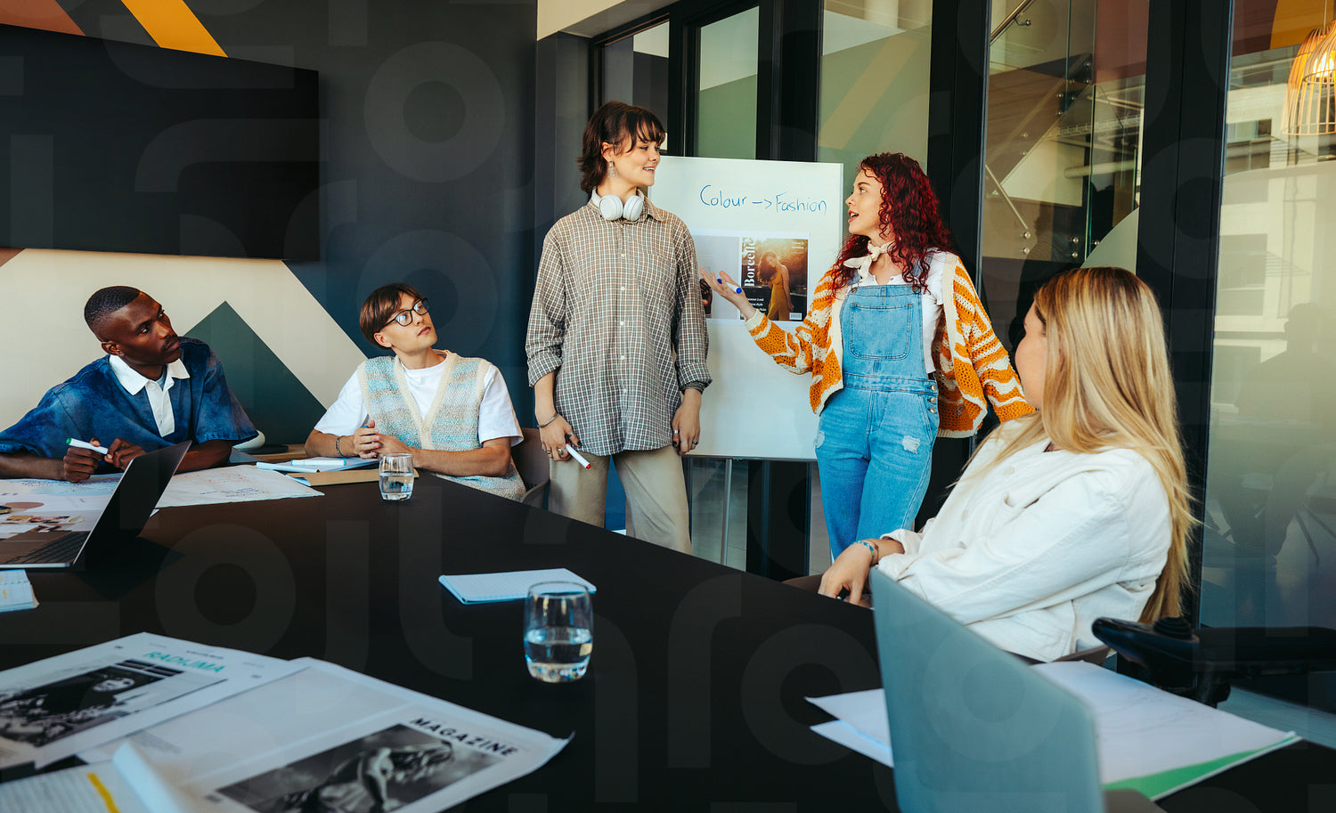 A diverse team engaged in a collaborative meeting in a modern office, discussing color theory and fashion concepts with passion and creativity.