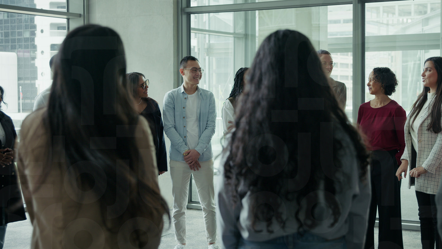 A group of business professionals engages in a collaborative discussion within a large, open office. Happy and connected, they are fostering a positive work environment for effective communication.